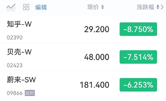 知乎开跌超8%,贝壳跌7超%,蔚来跌超6%